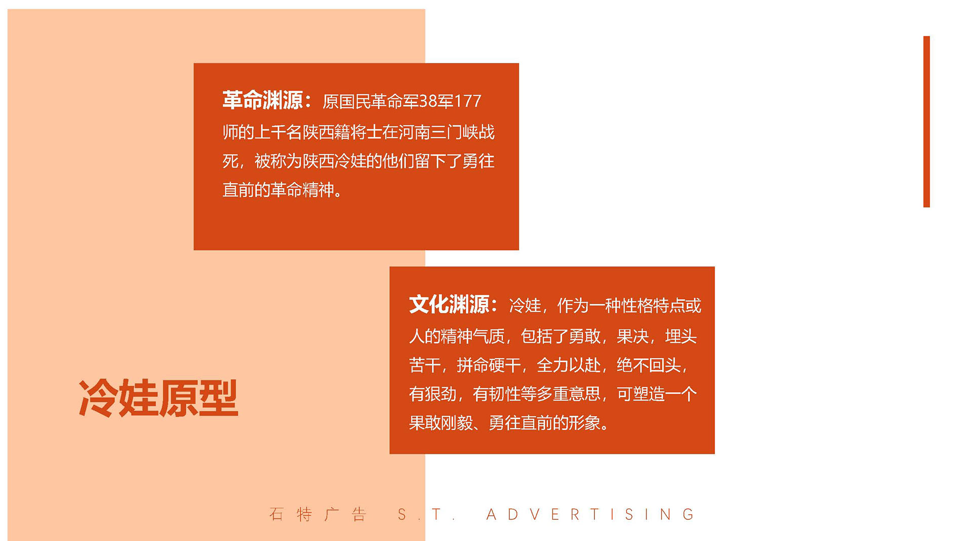文化淵源:冷娃,作為一種性格特點或人的精神氣質,包括了勇敢,果決,埋頭苦干,拼命硬干,全力以赴,絕不回頭,有狠勁,有韌性等多重意思,可塑造一個果敢剛毅、勇往直前的形象。