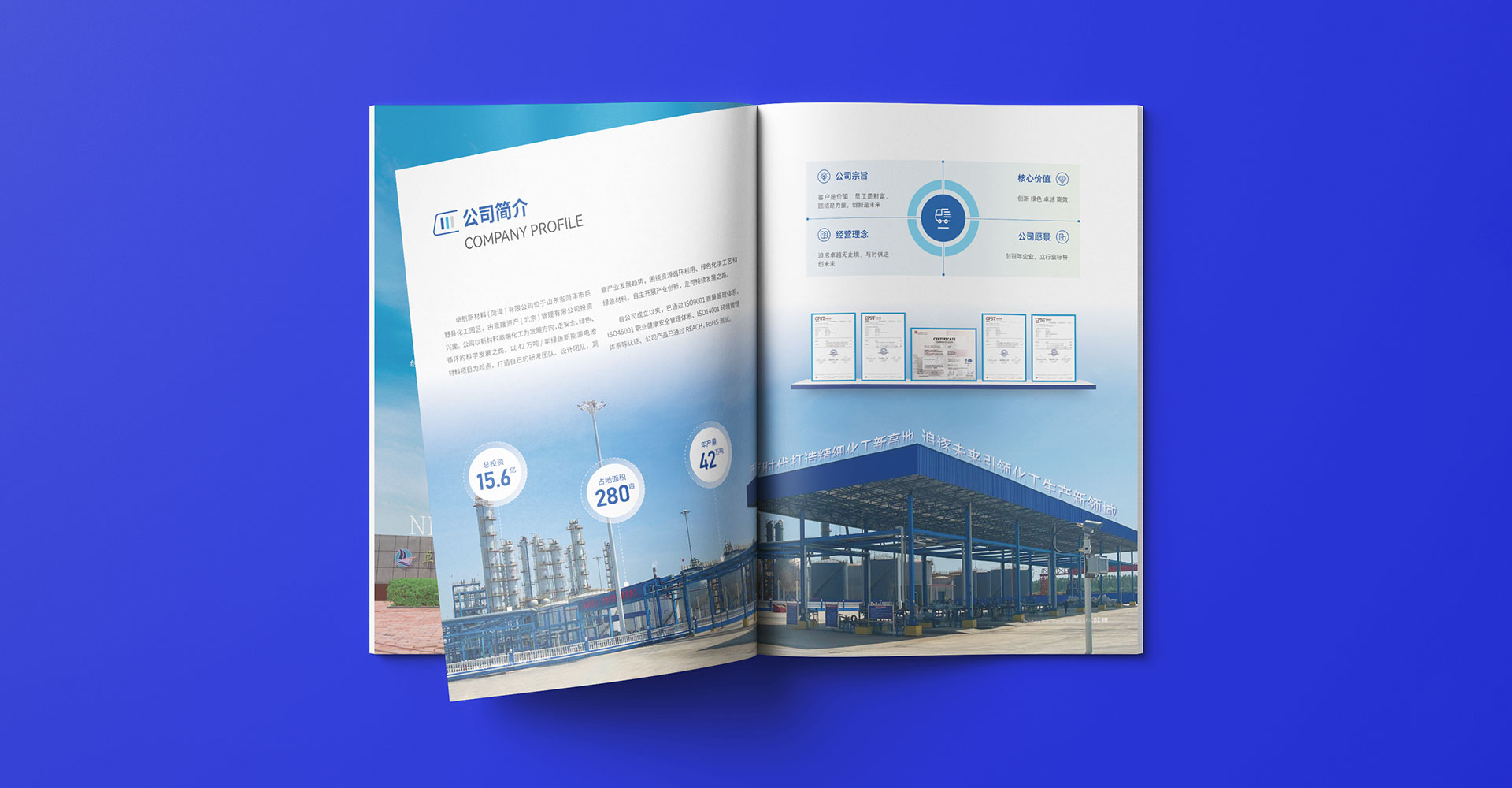 封面元素選用科技型簡單線條,深藍色貫穿全冊、搭配適量的白色或其他淺色調,使整本畫冊既沉穩(wěn)又明快,符合卓航新材料的品牌調性。