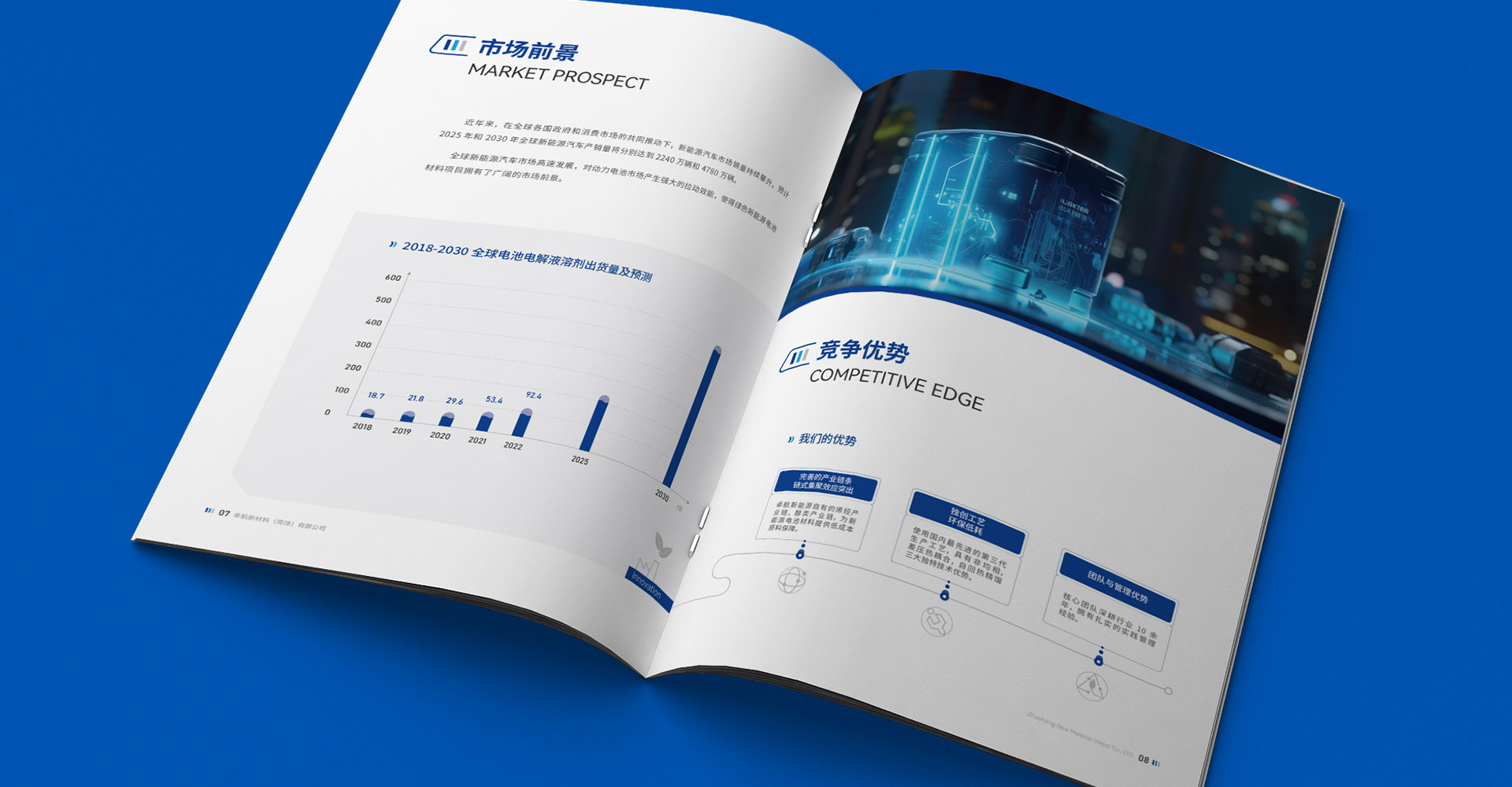 我們將宣傳冊分為公司簡介、公司環(huán)境、綠色新能源電池材料項目、市場前景、競爭優(yōu)勢以及產(chǎn)品介紹等六個板塊。公司簡介及環(huán)境讓受眾對企業(yè)有一個基本的認識,重點介紹綠色新能源電池材料項目,并對市場前景、競爭優(yōu)勢進行分析,幫助受眾梳理企業(yè)強勢之處,以體現(xiàn)卓航新材料的專業(yè)性和領先性,展示產(chǎn)品時圖文結合,配合圖表,信息分明。