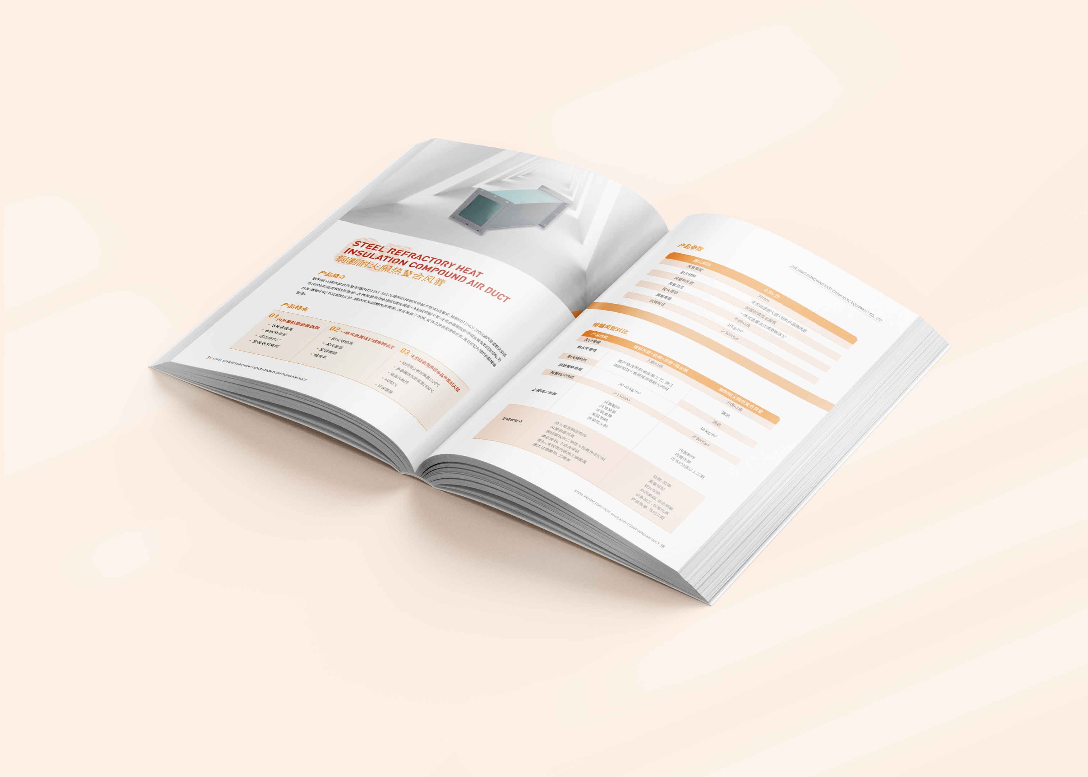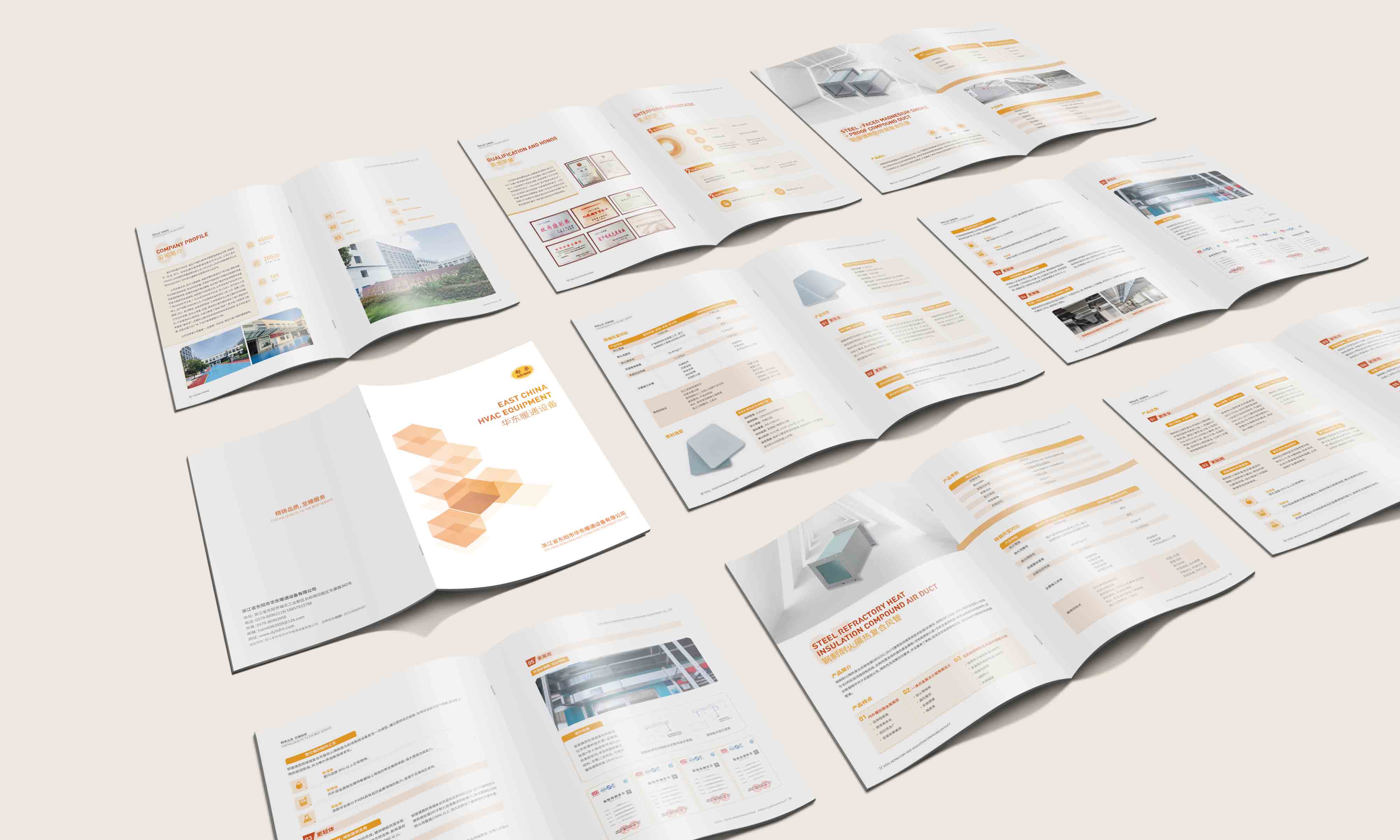 石特從公司概況、產(chǎn)品展示等角度著手設(shè)計(jì)華東暖通設(shè)備公司的產(chǎn)品宣傳冊(cè):