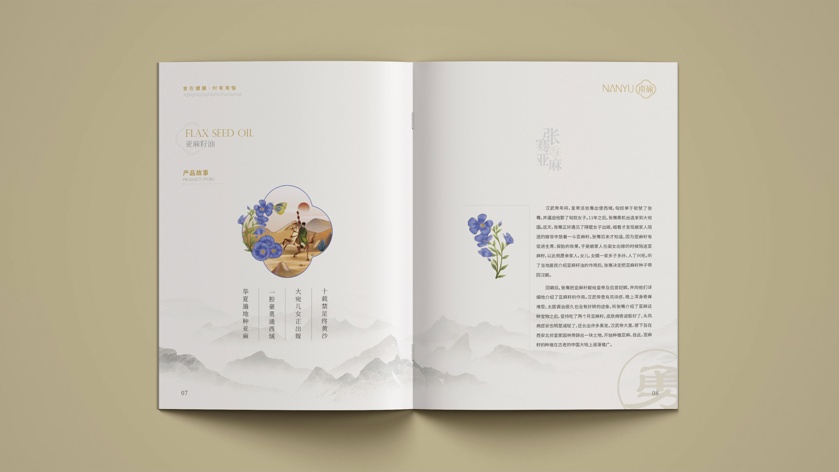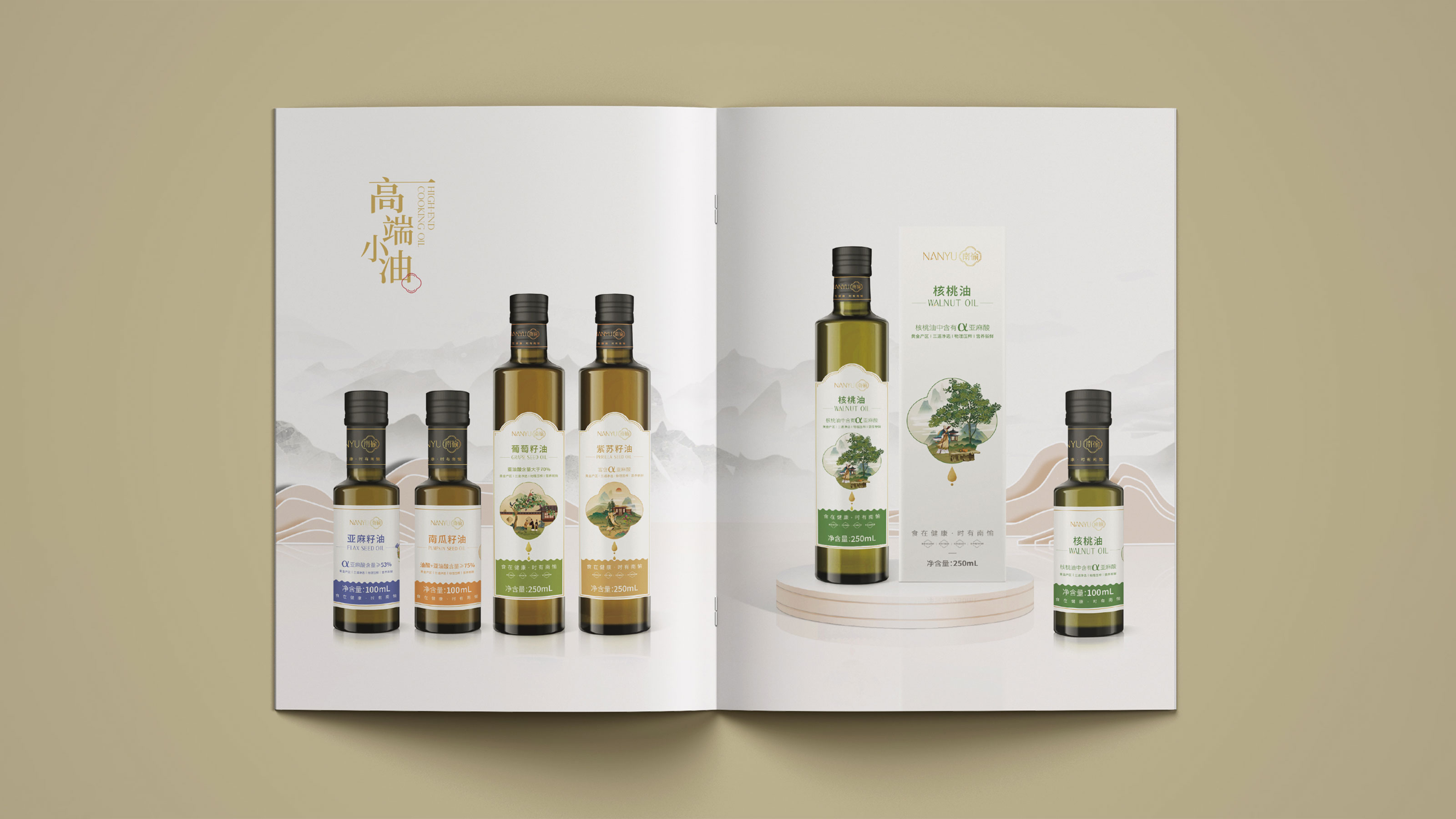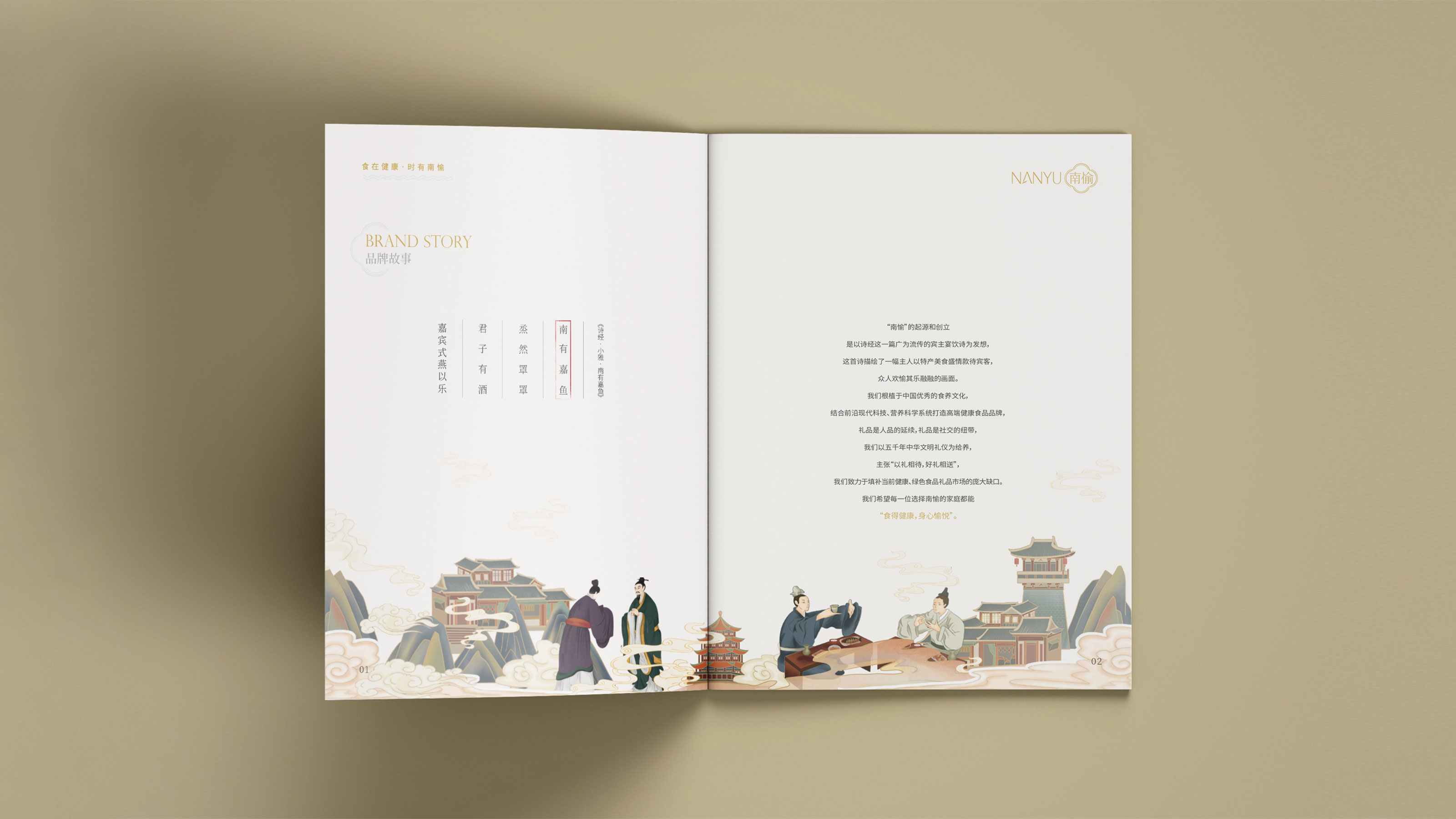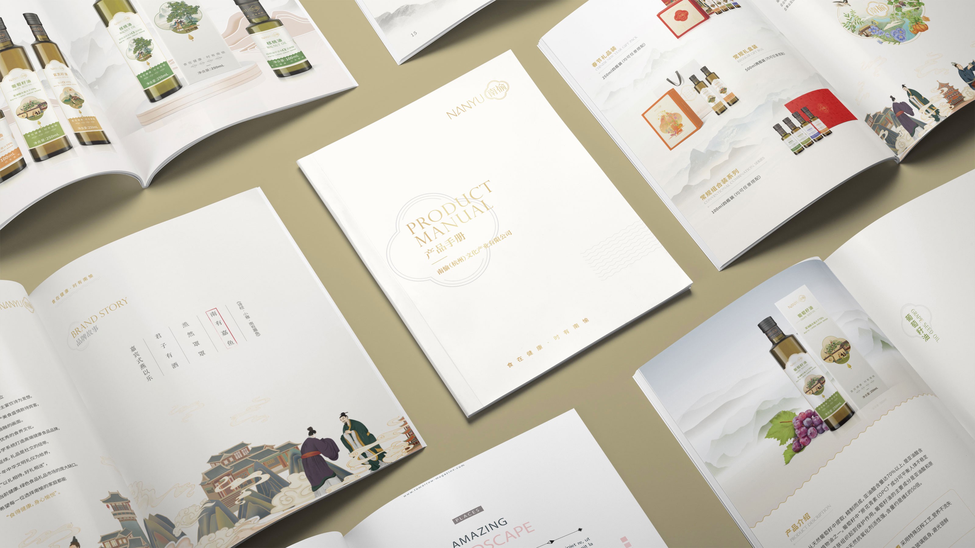 畫冊是企業(yè)及產(chǎn)品宣傳的重要表現(xiàn)形式之一,為更能夠突出展現(xiàn)南愉品牌的形象,石特進行了深入的思考。在畫冊的設(shè)計中,石特結(jié)合南榆自身的品牌定位以及產(chǎn)品特性,決定將中國傳統(tǒng)文化融入其中。封面采用金色字體描出品牌logo和定位語,簡潔大氣,到了講品牌故事的頁面,一個原創(chuàng)手繪插畫故事進入你的視線,令人欣喜的是,故事中人物的舉手投足之間滿是傳統(tǒng)禮儀的縮影,這與南愉的“以禮相待”非常契合,這還不夠,在后續(xù)品牌文化的闡釋以及產(chǎn)品的介紹中,傳統(tǒng)水墨作為背景點綴其中,無一不顯現(xiàn)傳統(tǒng)文化的獨特魅力,圖文的排版輕松自然,提升了人們對葡萄籽油、核桃油以及亞麻籽油產(chǎn)品的閱讀興趣,將“食在健康,時有南愉”體現(xiàn)的淋漓盡致。