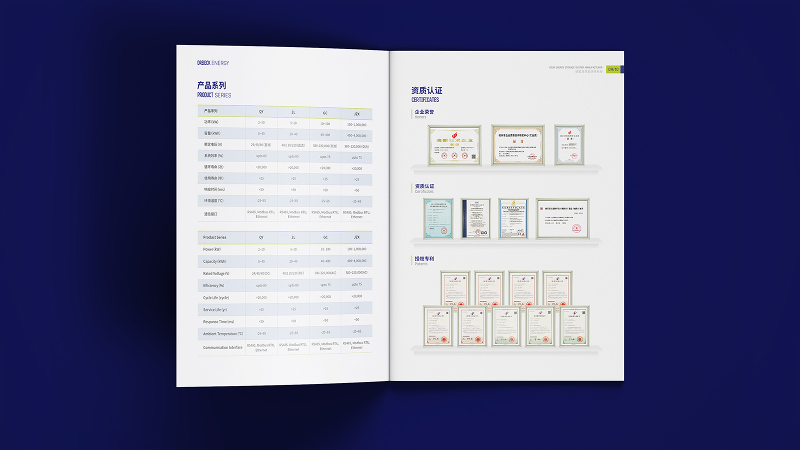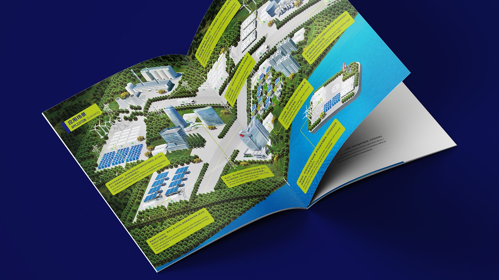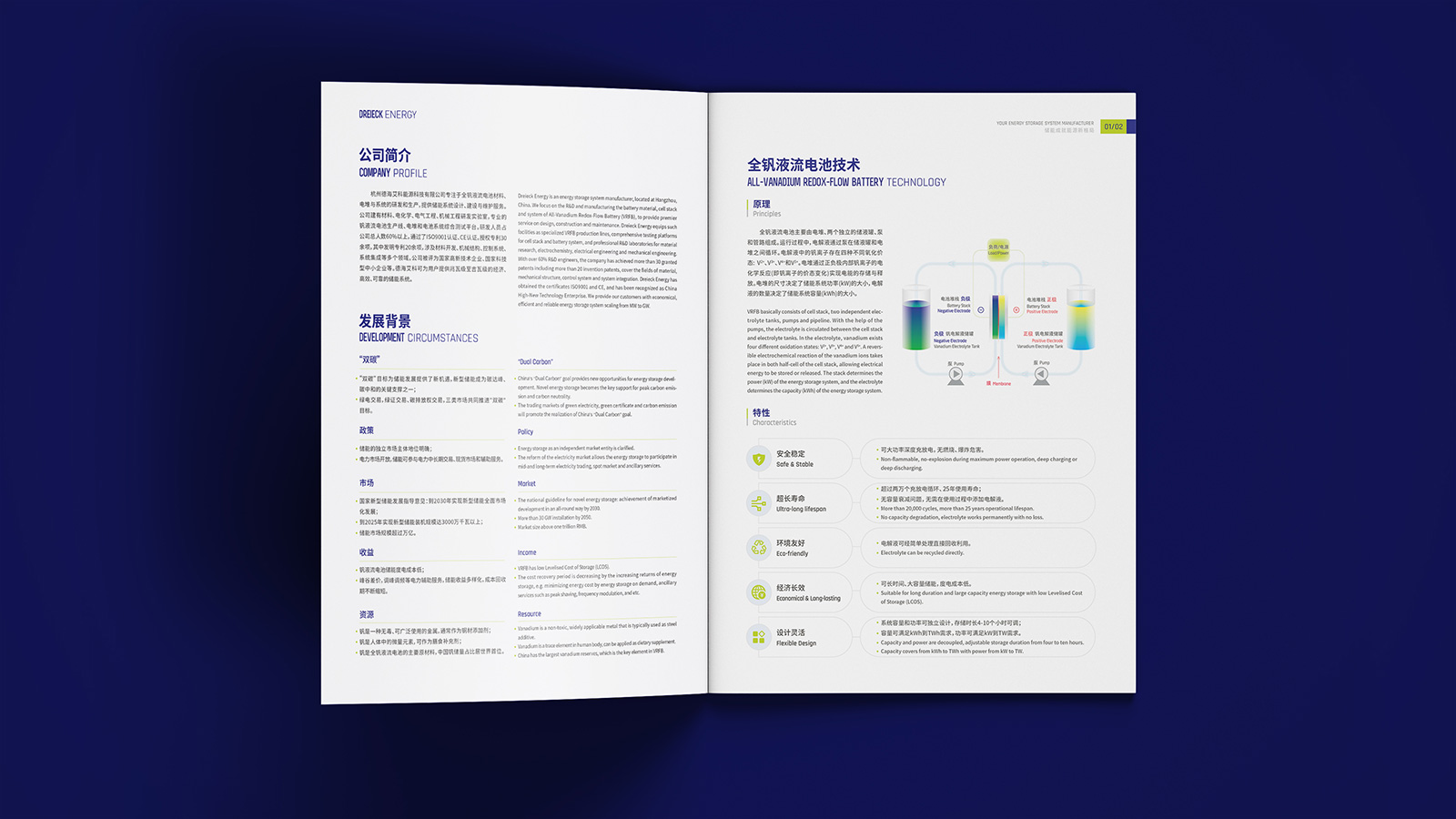 企業的畫冊設計要站在品牌建設的高度,不僅需要展現企業的品牌形象,還需要設計出品牌的個性來,基于此,在此次的畫冊設計中,石特提出了新的想法。封面封底以淡綠色和深藍色為主,帶給人一種嚴謹務實、值得信任的感覺;內容上首先以圖文結合的形式先對企業的基本情況進行介紹,然后闡述了全釩液流電池技術的原理以及應用場景,并對儲能電站的相關知識進行了科普,最后以典型案例、產品系列、資質認證的介紹為結尾,該畫冊簡潔美觀、主次分明,德海艾科人嚴謹務實的工作態度和創新的精神得到了系統且充分的展示。