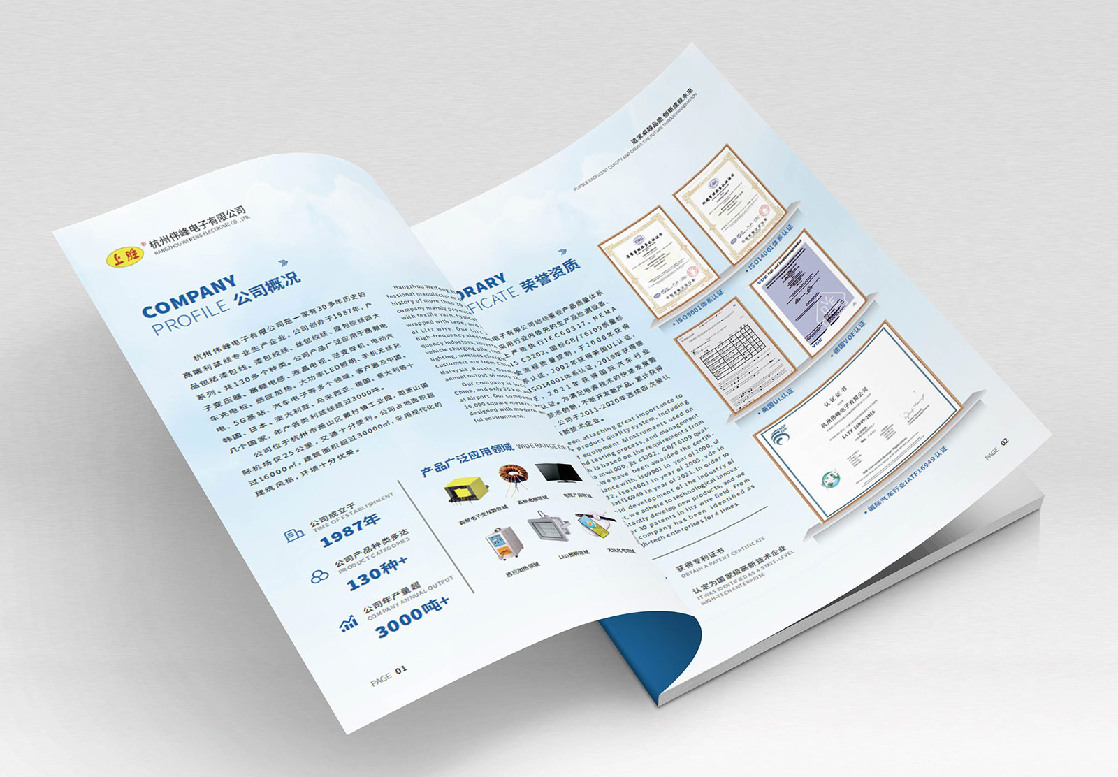 杭州偉峰電子有限公司是一家有近30年歷史的高端銅繞組線專業生產企業,主要生產漆包絞合線、絲包漆包絞合線、膜包漆包絞合線三個系列、共40多個品種的繞組線,公司產品廣泛應用于高頻電感、無線充電等多個領域,客戶遍及中國、韓國、日本、澳大利亞、俄羅斯等十幾個國家,年產繞組線超過3000噸。為能更好的展示企業實力及品牌形象,偉峰電子希望通過宣傳冊為對外宣傳的一個重要窗口,因此找到石特。