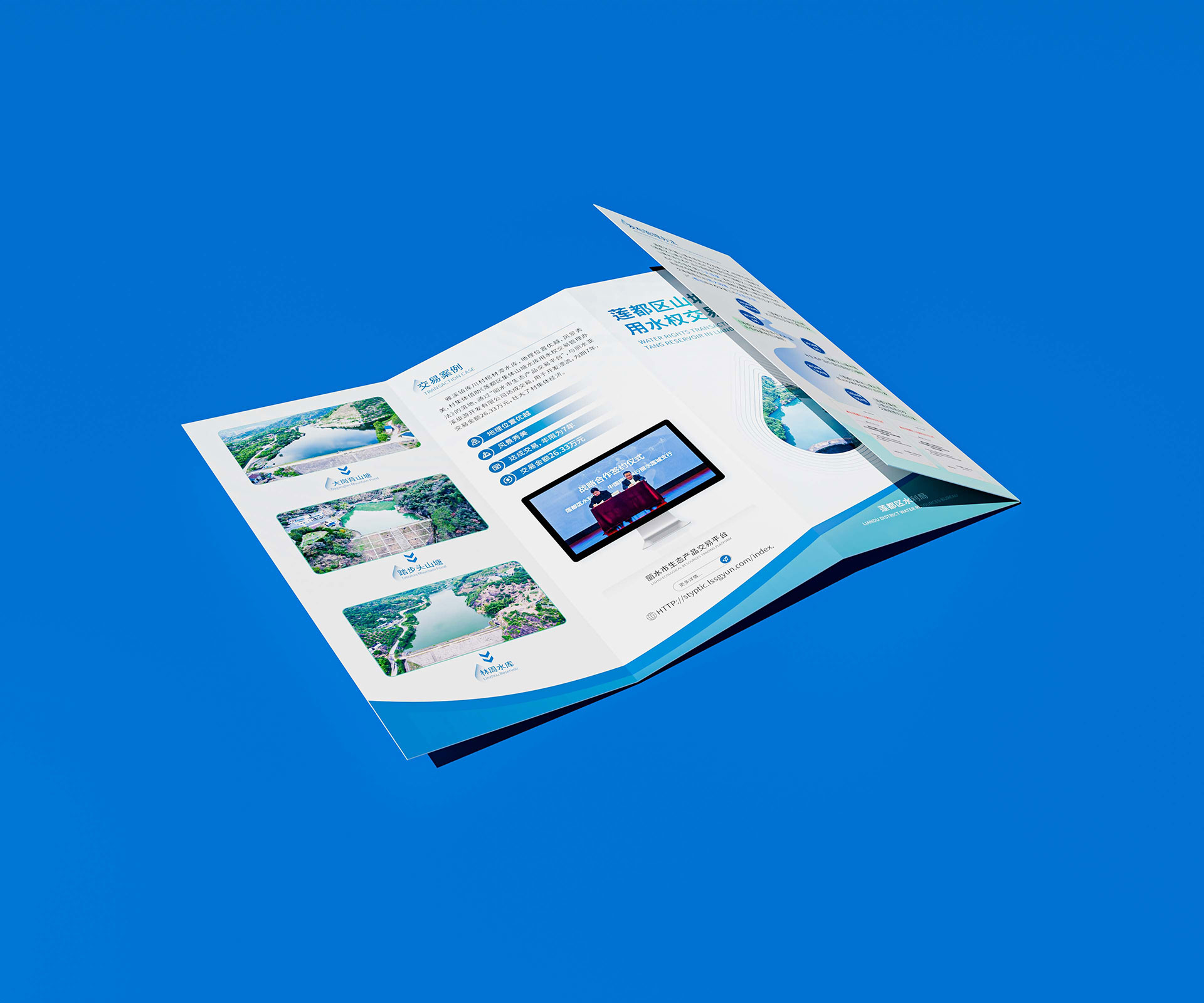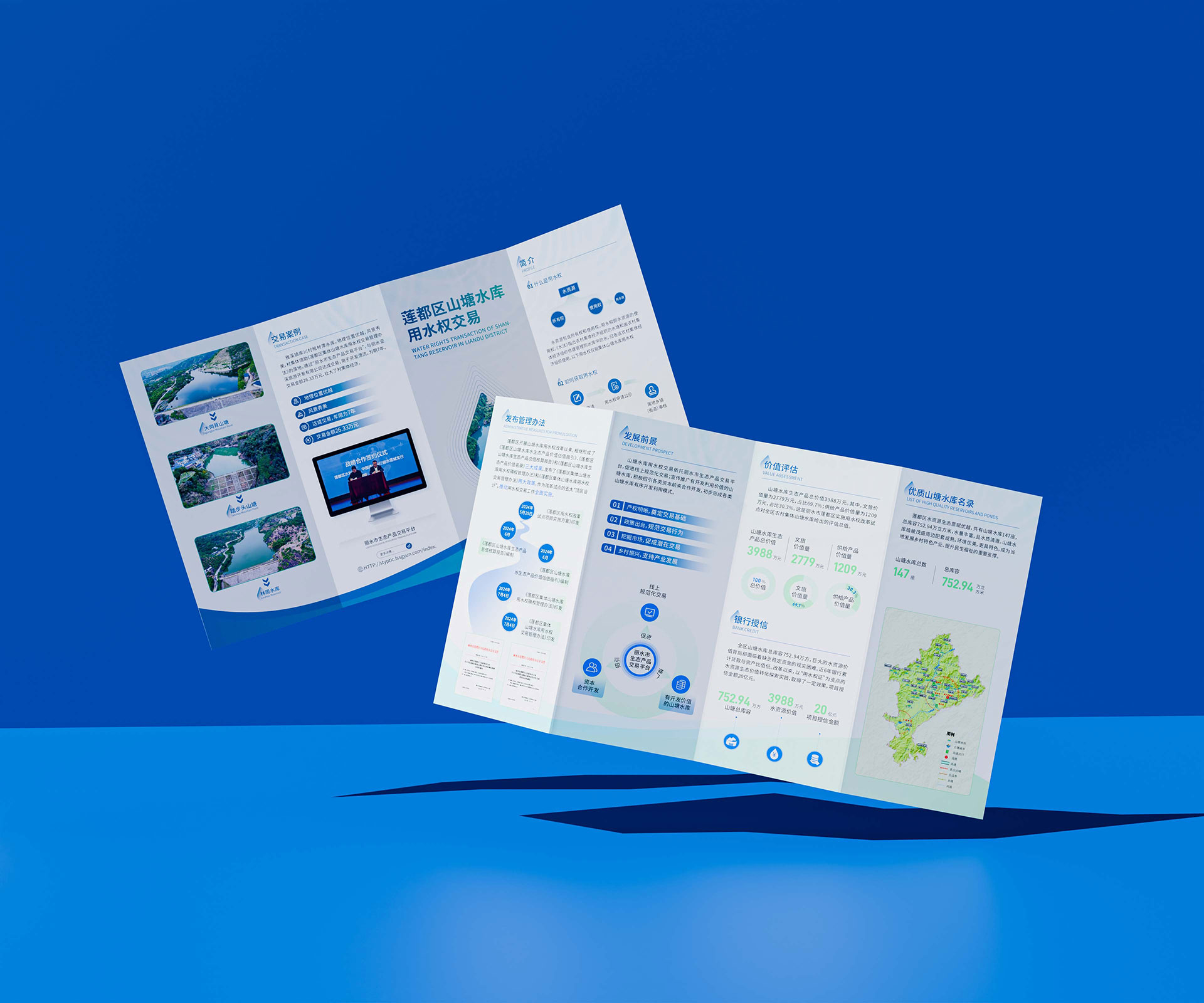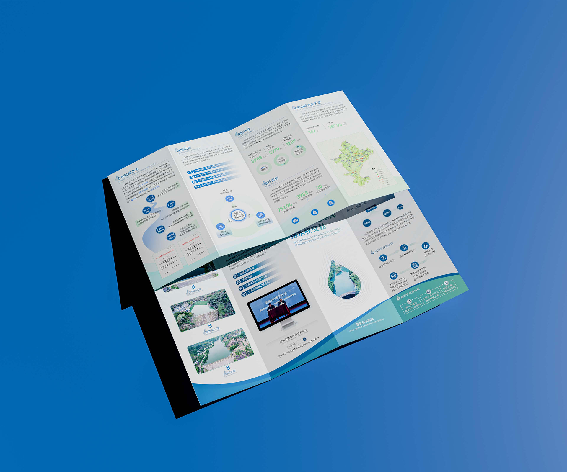 本四折頁設計作為生態產品交易的首張水利工程名片,助力庫坑山塘項目在麗水生態產品交易平臺獲得超1000次瀏覽,吸引15家機構參與競價。其創新價值體現在三方面: