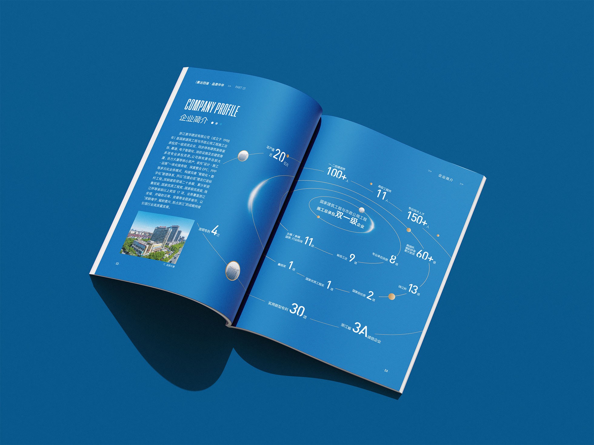 結構化信息設計與高效閱讀: 針對建筑行業信息量大的特點,運用清晰的信息層級、圖標化歸納與數據圖表,將復雜的企業資質、技術參數等內容進行可視化處理,極大提升了畫冊的可讀性與信息檢索效率,方便客戶快速了解企業核心優勢。