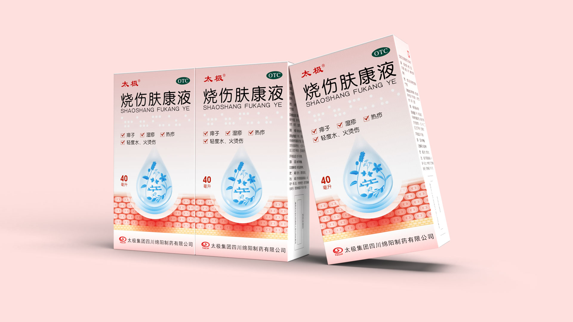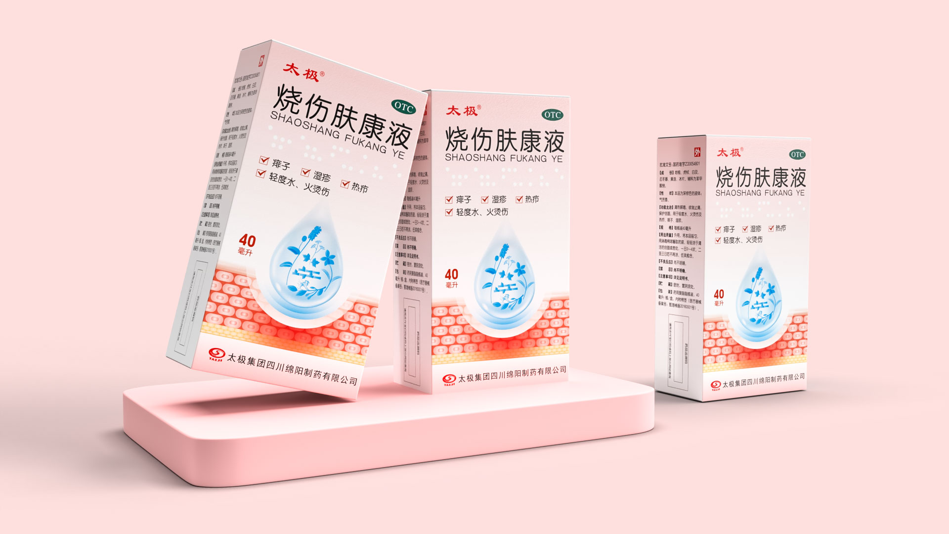 水滴形象生動地展現了產品的液態本質,而五味藥材環繞其周,恰似提煉了藥材的精粹,凝聚于這滴水珠之中,這一設計細節凸顯了產品中草藥的天然成分,以及其原生態、安全的特點。皮膚組織模擬皮膚受損時的泛紅和疼痛狀態,直觀地傳達了產品能夠精準、快速緩解癥狀的優勢。整體設計風格醒目且易于識別,與產品通用名“燒傷膚康液”高度契合。這種具象化的呈現方式讓消費者能夠直觀地理解產品的作用機制,從而更方便快捷地做出購買決策。