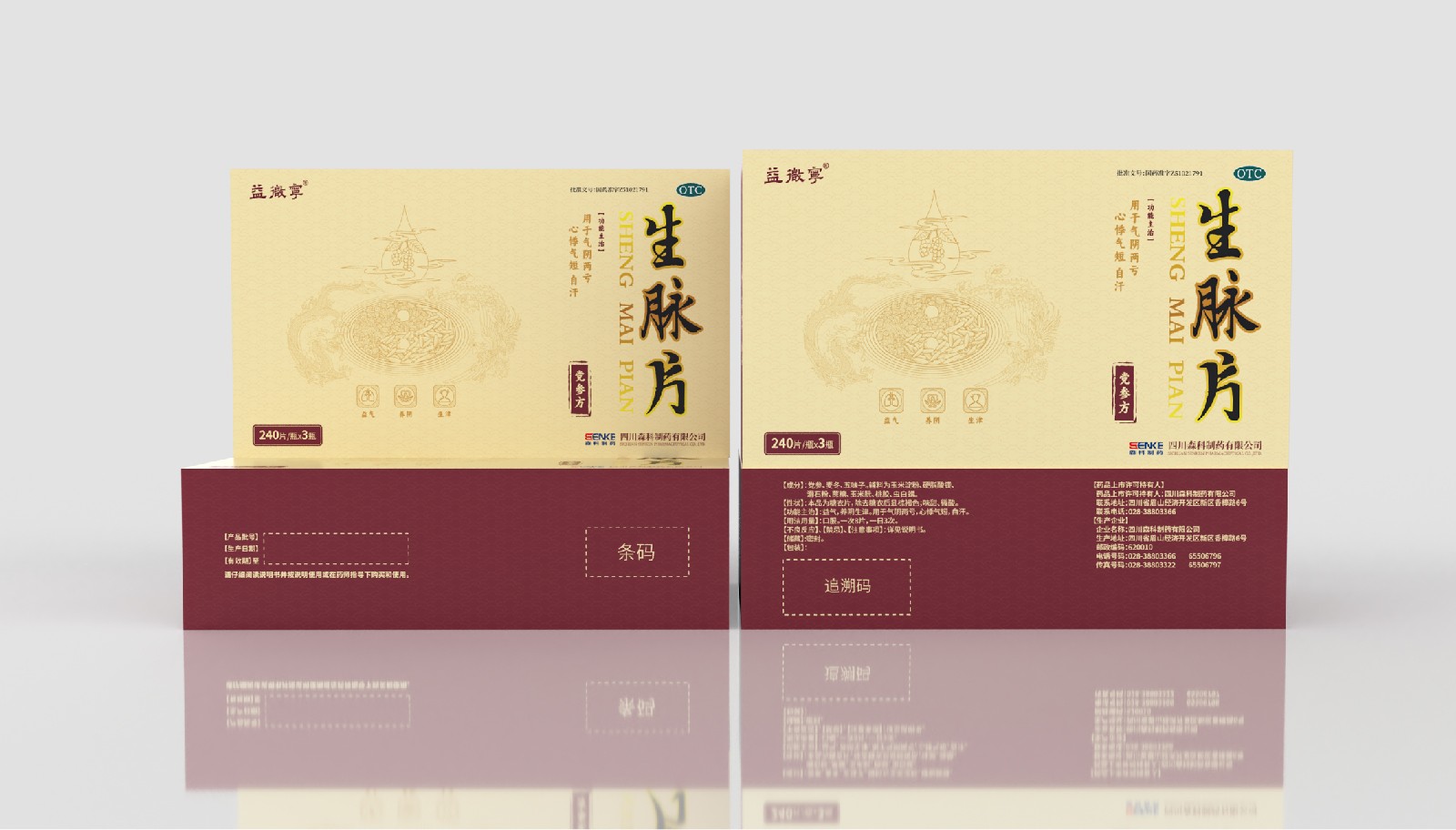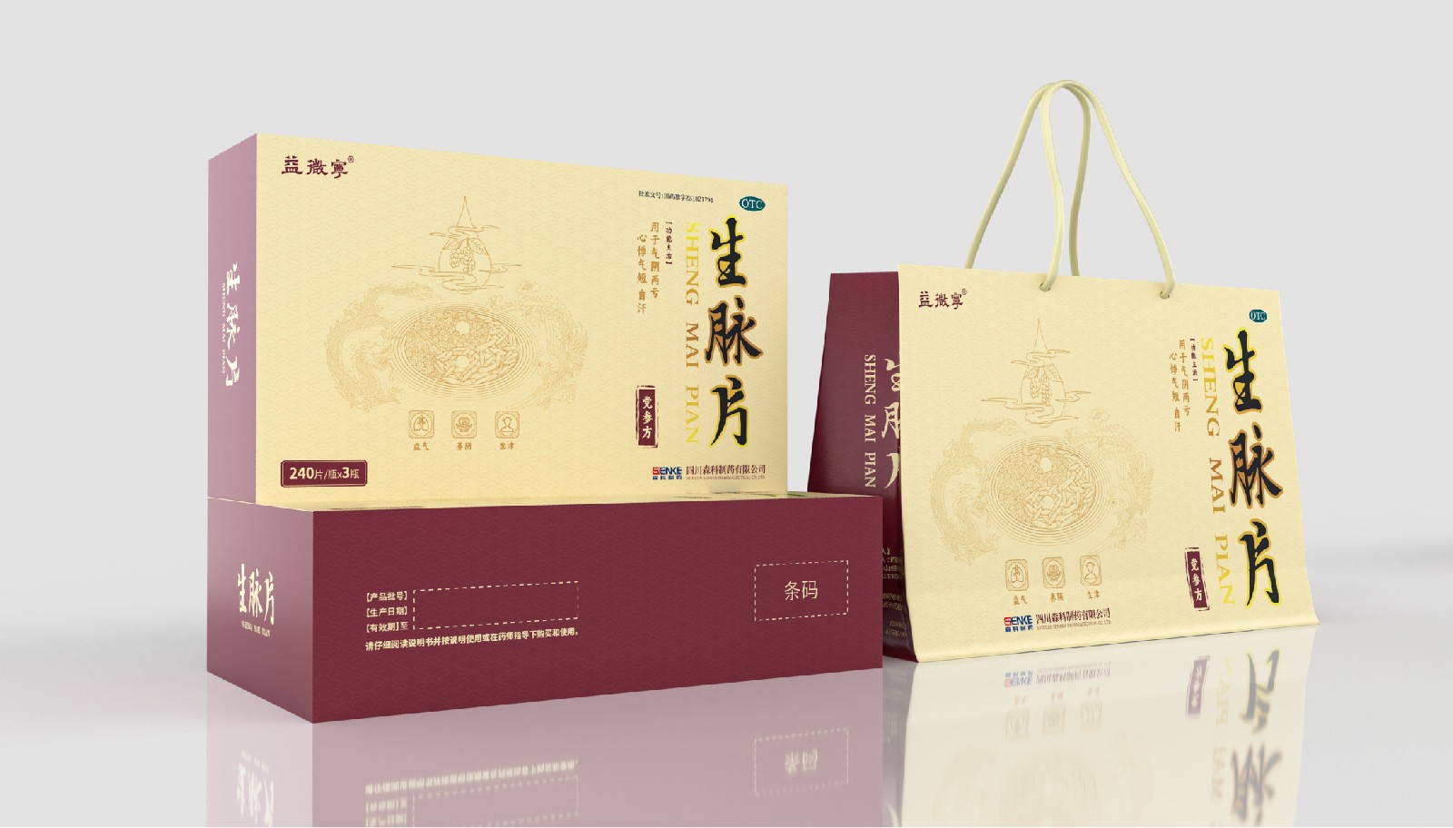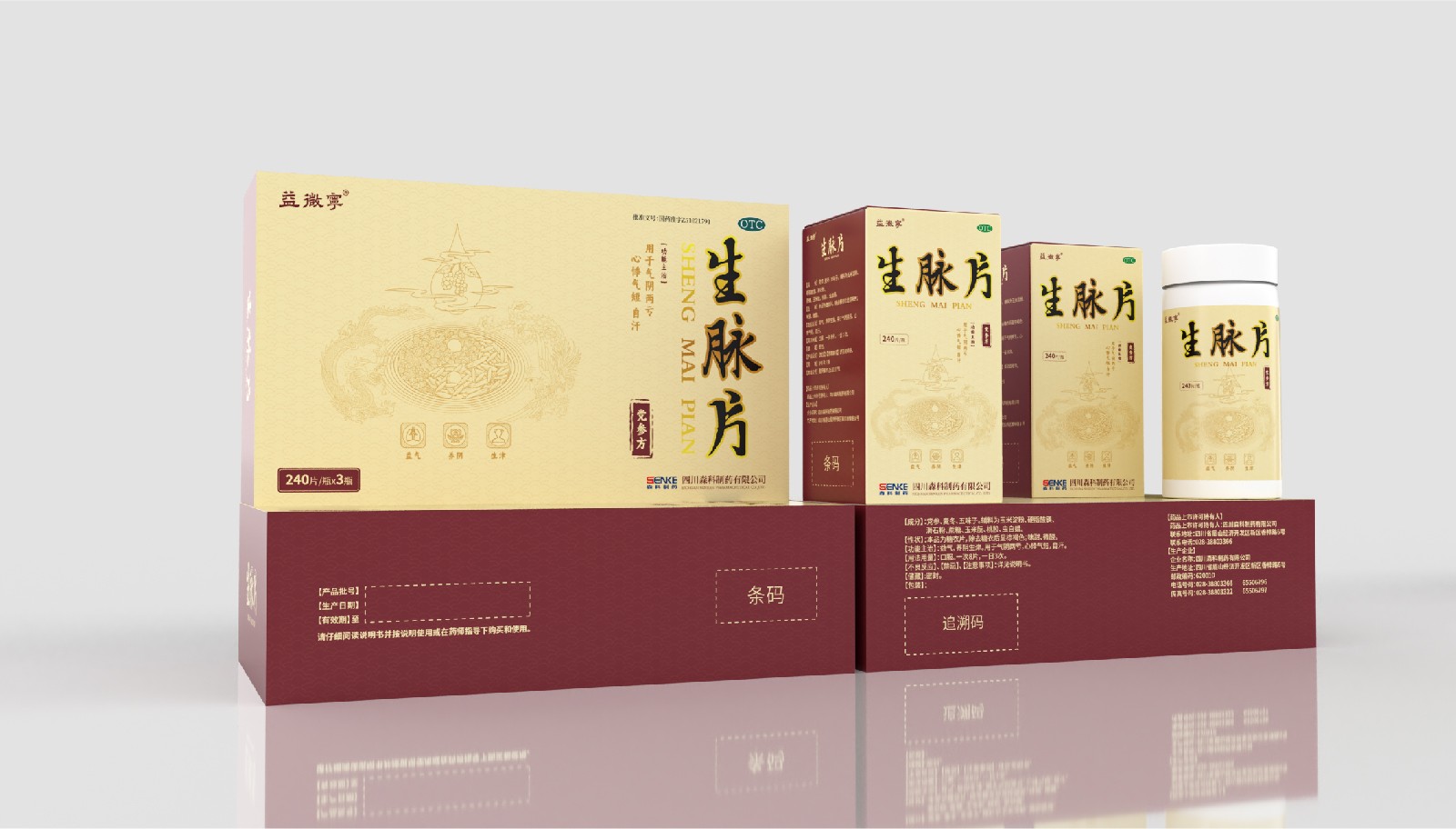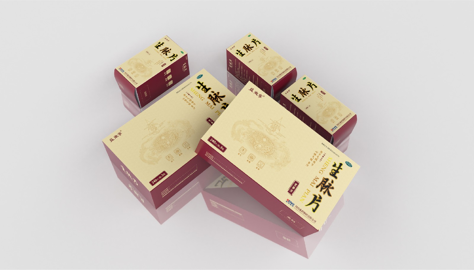 設計方案中產品材料圖樣放于主畫面起到強調作用。本著審美與實用相統一的原則,此處圖案為八卦造型與三味藥材(黨參、麥冬、五味子)插畫的結合作為包裝主畫面。線條、色塊清晰明快,既能凸顯藥材的陰陽調和作用,也能增加產品的視覺沖擊力并加入中國傳統紋樣。