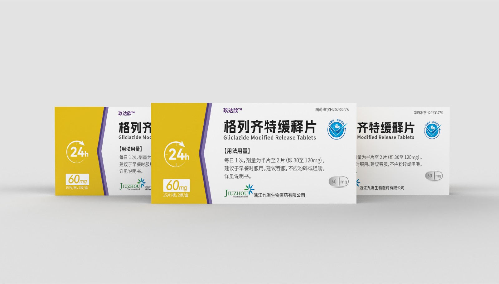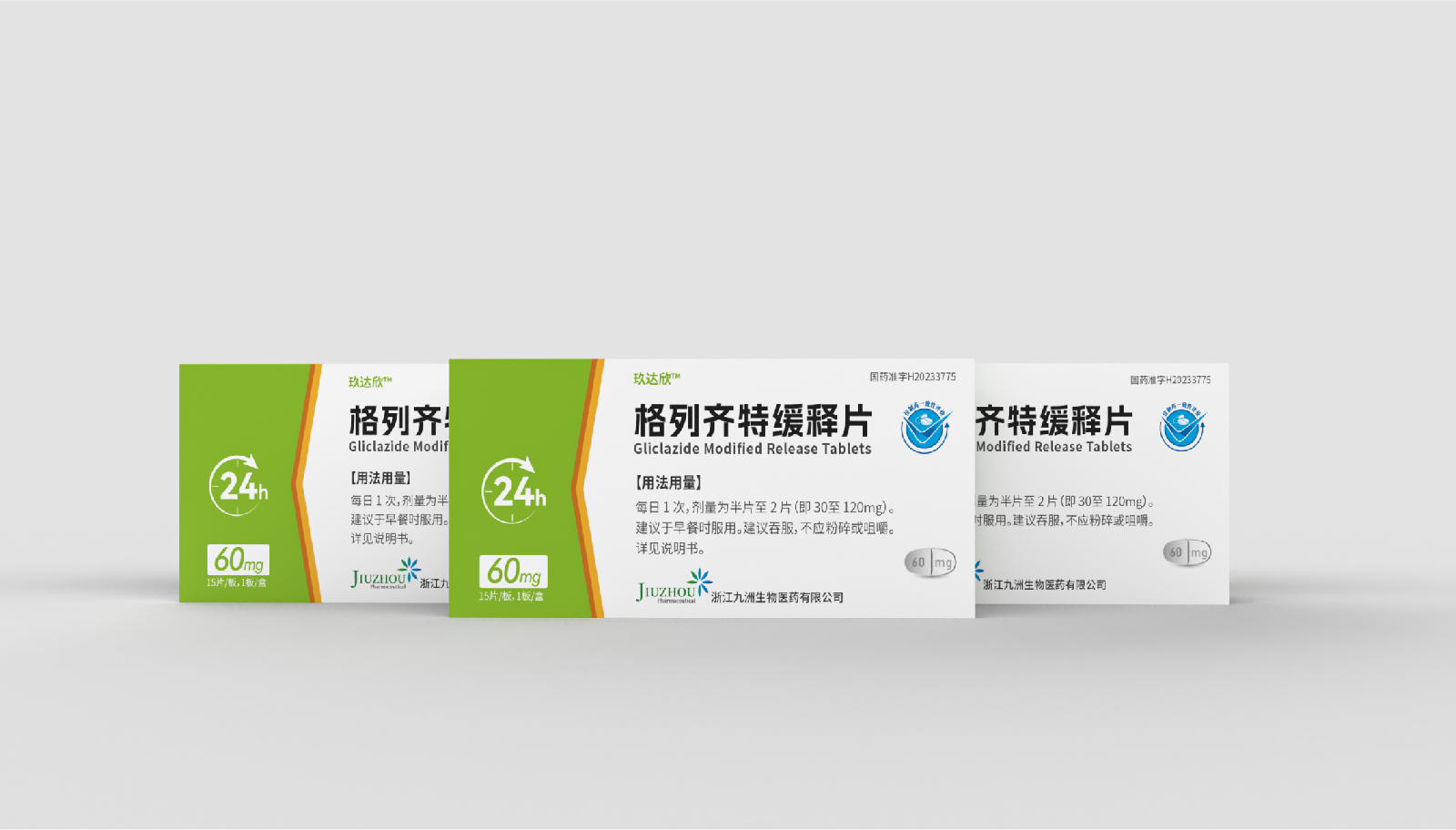 設(shè)計(jì)方案中藥效持續(xù)時(shí)間作為視覺符號出現(xiàn),起到強(qiáng)調(diào)藥突出作用。強(qiáng)調(diào)用法用量與藥效持續(xù)時(shí)間數(shù)字“1”、“24”做傾斜處理體現(xiàn)速度感,在起到突出強(qiáng)調(diào)的同時(shí),也體現(xiàn)藥片控制血糖速度之感。企業(yè)標(biāo)志和企業(yè)名稱結(jié)合使用突出企業(yè)形象。藥片設(shè)計(jì)突出單片藥劑量和藥片可掰片使用。