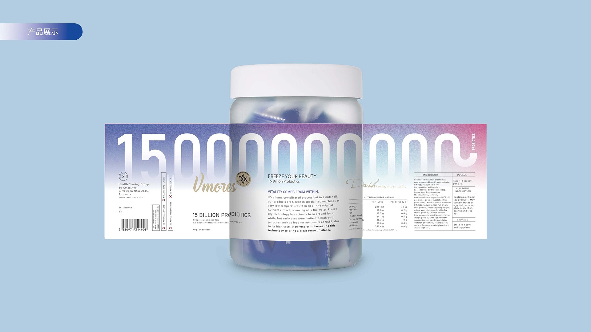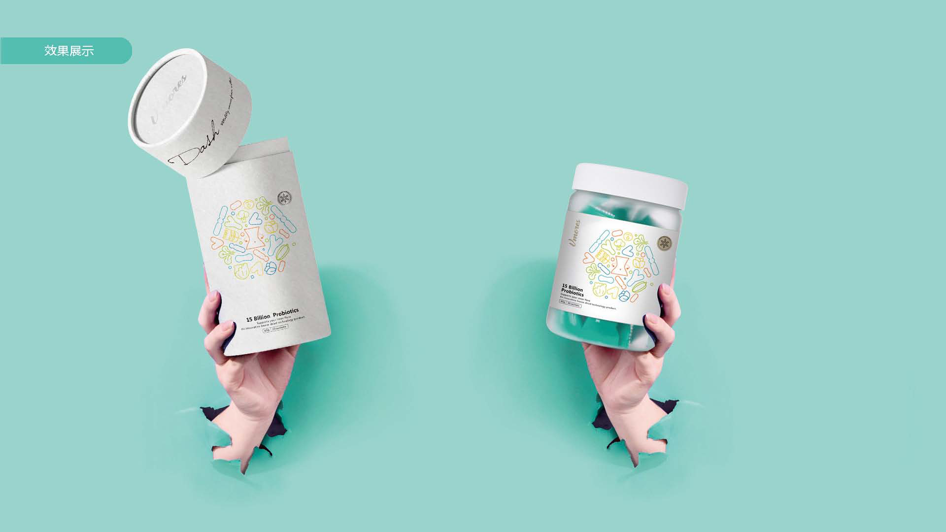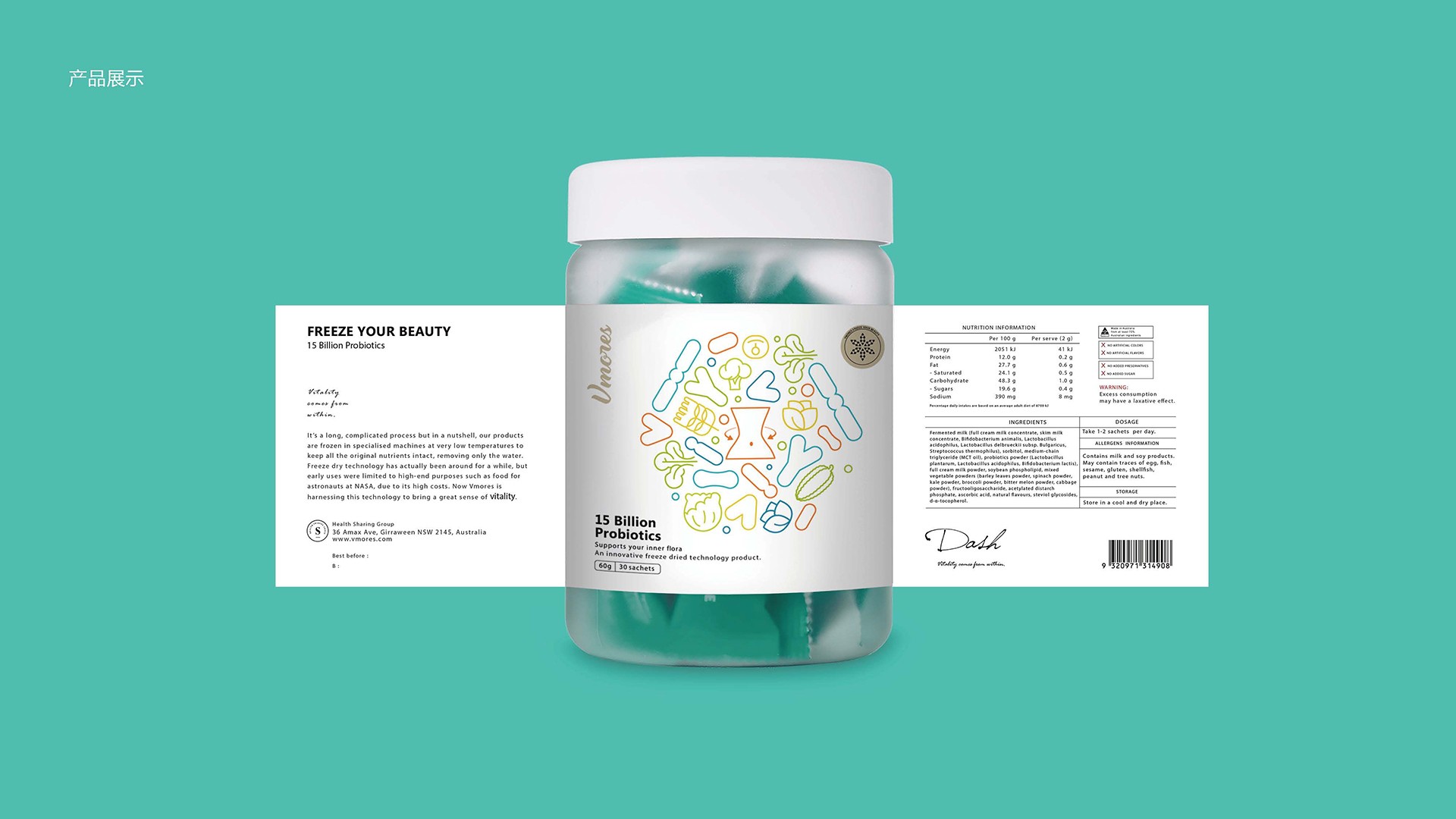 突出150億益生菌,以大額數字吸引眼球;將數字設計成腸道形狀,表現“瘦子菌”是腸道中的有益菌群,產品有益與腸道的功效;整體使用多彩的漸變色,符合產品調性及目標群眾的審美。此款包裝設計將產品效果和成分,以抽象的形式表現出來,插圖中心是瘦身效果,為產品功效,周圍是三種有益菌群,六種超級蔬菜的組合;說明產品營養健康,配色清新活波,較為年輕化。