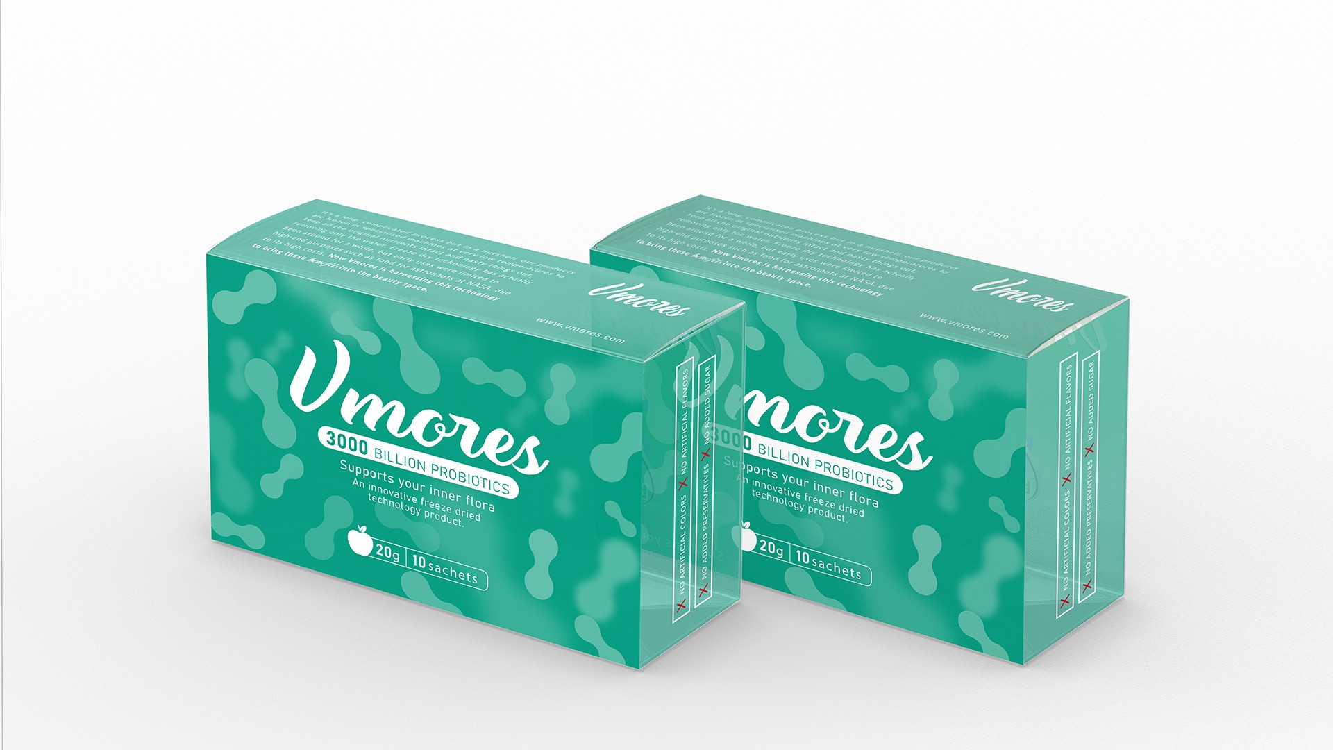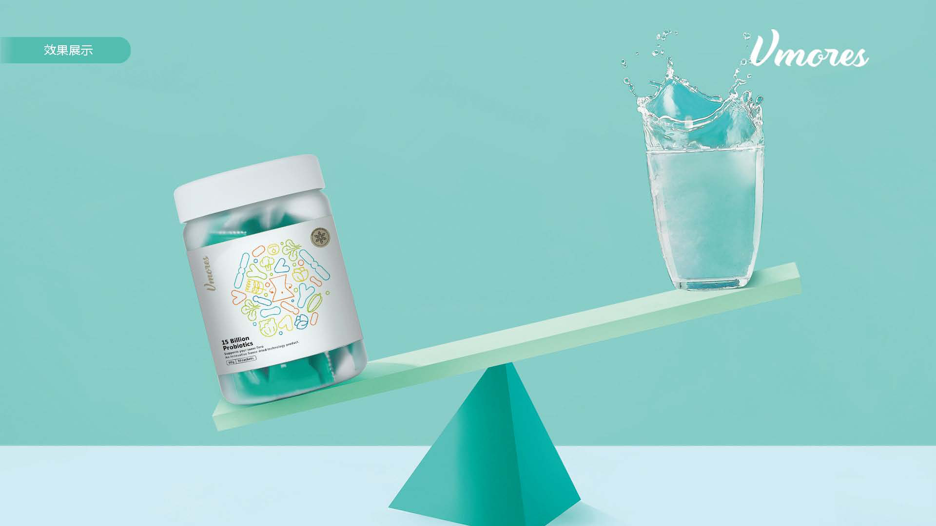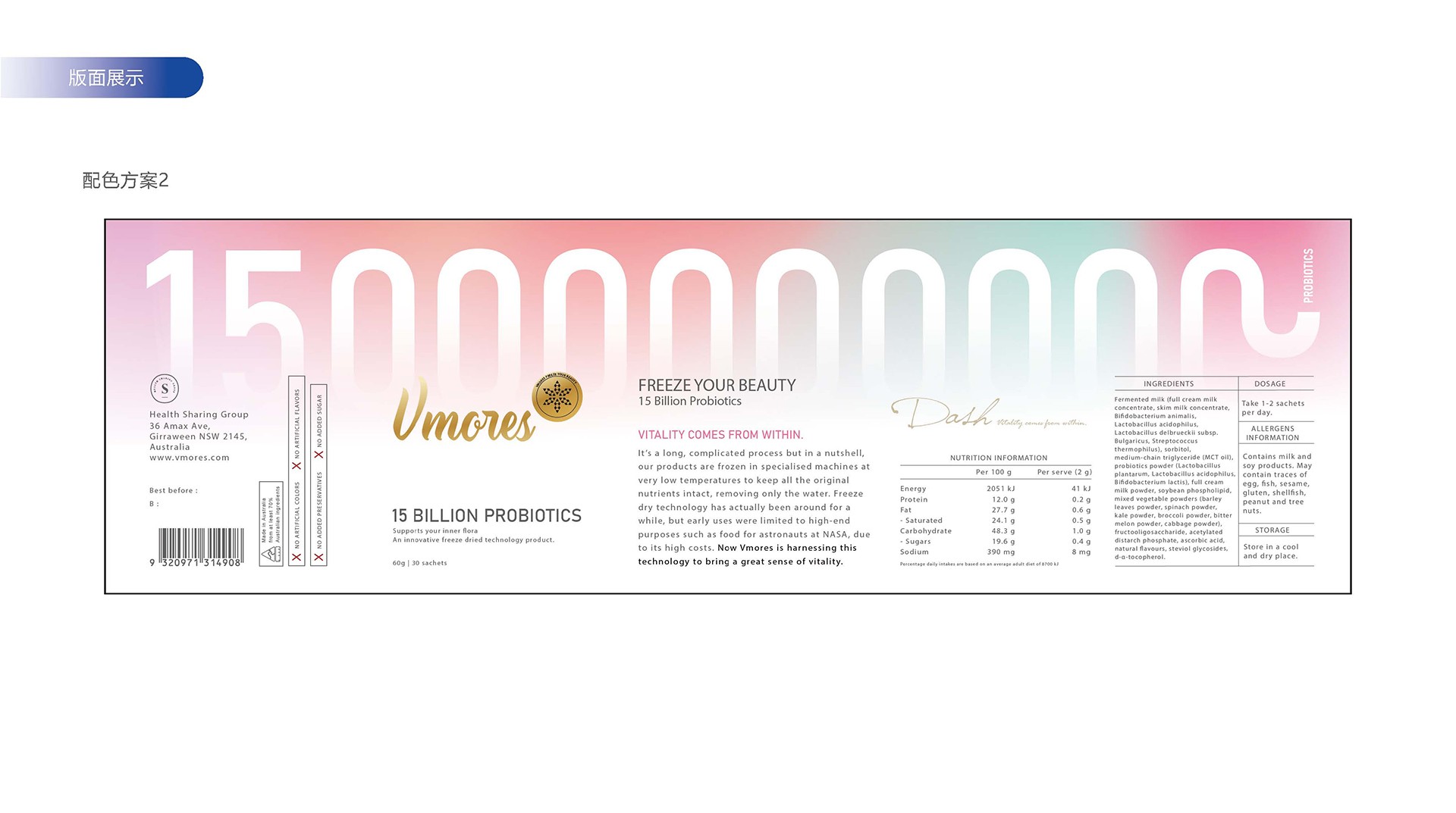 突出150億益生菌,以大額數字吸引眼球;將數字設計成腸道形狀,表現“瘦子菌”是腸道中的有益菌群,產品有益與腸道的功效;整體使用多彩的漸變色,符合產品調性及目標群眾的審美。此款包裝設計將產品效果和成分,以抽象的形式表現出來,插圖中心是瘦身效果,為產品功效,周圍是三種有益菌群,六種超級蔬菜的組合;說明產品營養健康,配色清新活波,較為年輕化。