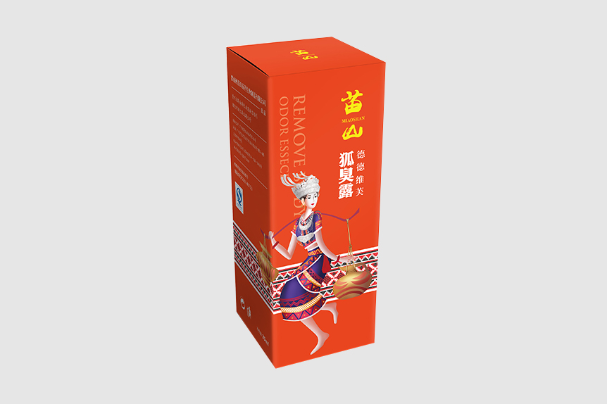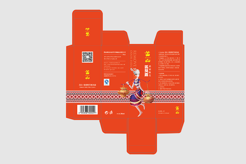 苗山狐臭露的包裝圖案設(shè)計為一個苗族女子挑了兩壇酒,處于一片紅色背景中。整個包裝看起來給人一種吉祥之兆,一般藥品包裝都比較冷色調(diào),這里給人暖的感覺。里面的瓶子外形小巧精致,采用經(jīng)典的黑白色給人一種沉穩(wěn)感。
