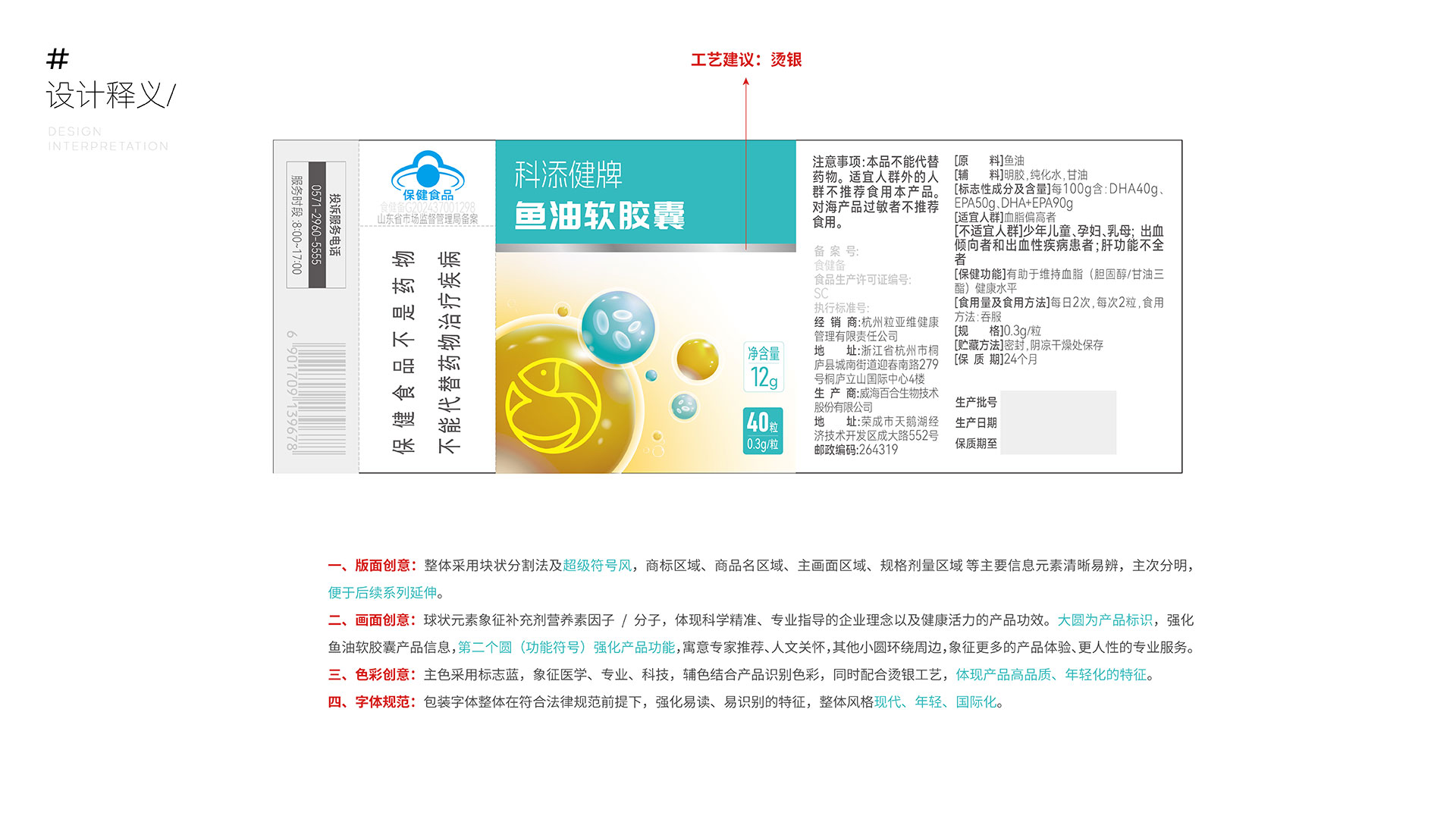 三、色彩創(chuàng)意:主色采用標(biāo)志藍,象征醫(yī)學(xué)、專業(yè)、科技,輔色結(jié)合產(chǎn)品識別色彩,同時配合燙銀工藝,體現(xiàn)產(chǎn)品高品質(zhì)、年輕化的特征。
